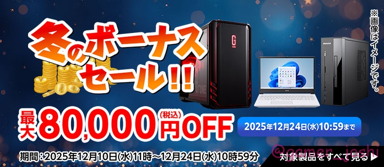セール・キャンペーン名 冬のボーナスセール 期間 2025/12/10~2025/12/24 主な内容 ゲーミングPCやクリエイターPCなど厳選されたノートパソコンやデスクトップパソコンの人気製品が期間限定・お買い得価格!