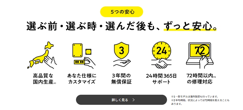 さらに、24時間365日対応の電話サポートや、オンサイト修理サービス(対象モデルのみ)など、アフターサポートも充実しています。こうした手厚い保証体制により、購入後も安心してPCを運用できます。