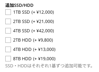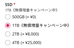 通常は500GB SSDが標準構成となっているモデルでも、キャンペーン期間中であれば1TBや2TB SSDへ無料または割安でアップグレードできる場合があり、非常にお得です。