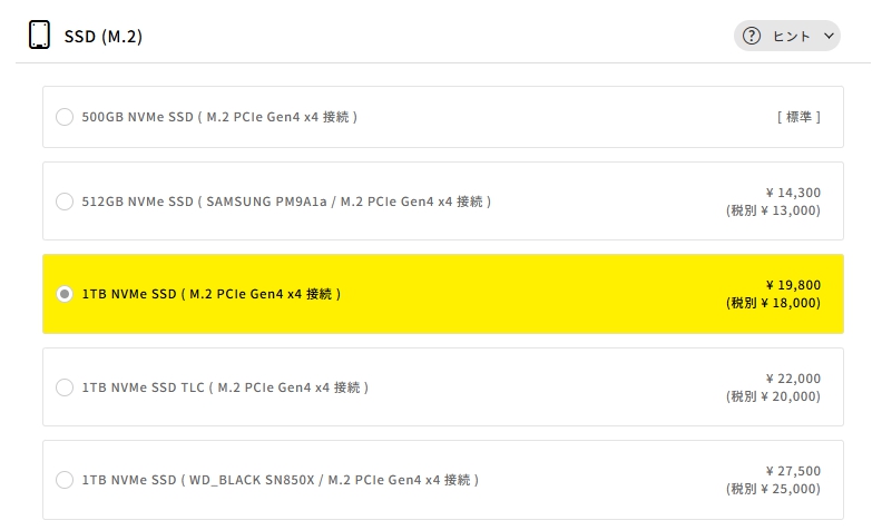 ストレージ:500GB NVMe M.2 SSD(Gen4×4)
