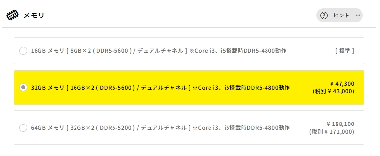 | メモリ | 16GB (8GB×2 / DDR5-4800) |